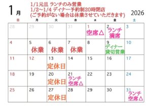 - 2025年12月24日 【1月の営業ご案内】 ◎1/1元旦ランチ営業のみ、現在ご予約…