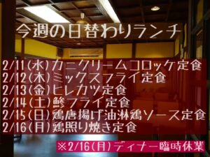 - 2026年01月14日 【2月営業お知らせ】 ◎2/7(土)と2/18(水)ランチタ…